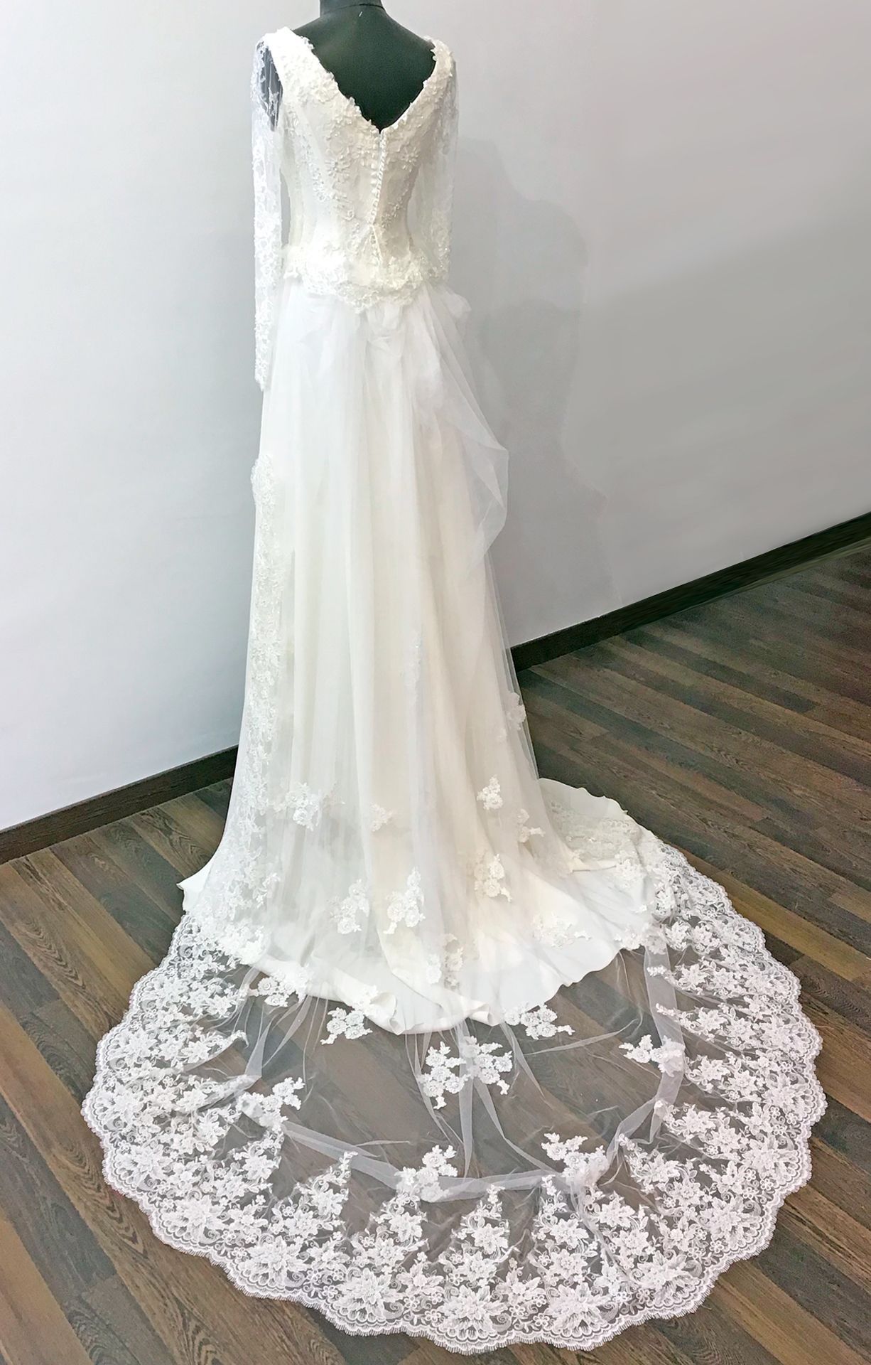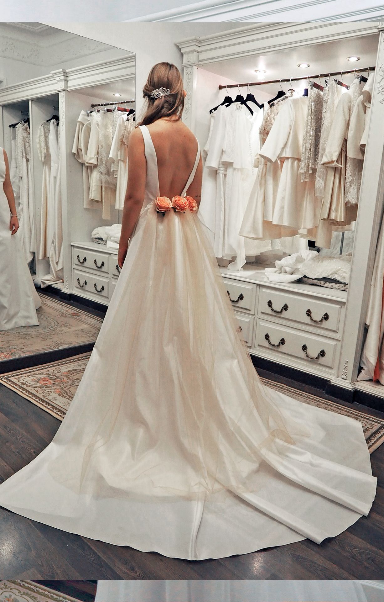Adaptamos cada detalle a tu boda: el largo y la cola según el lugar y la estación, e incluso incorporamos elementos especiales como tejidos o adornos familiares.